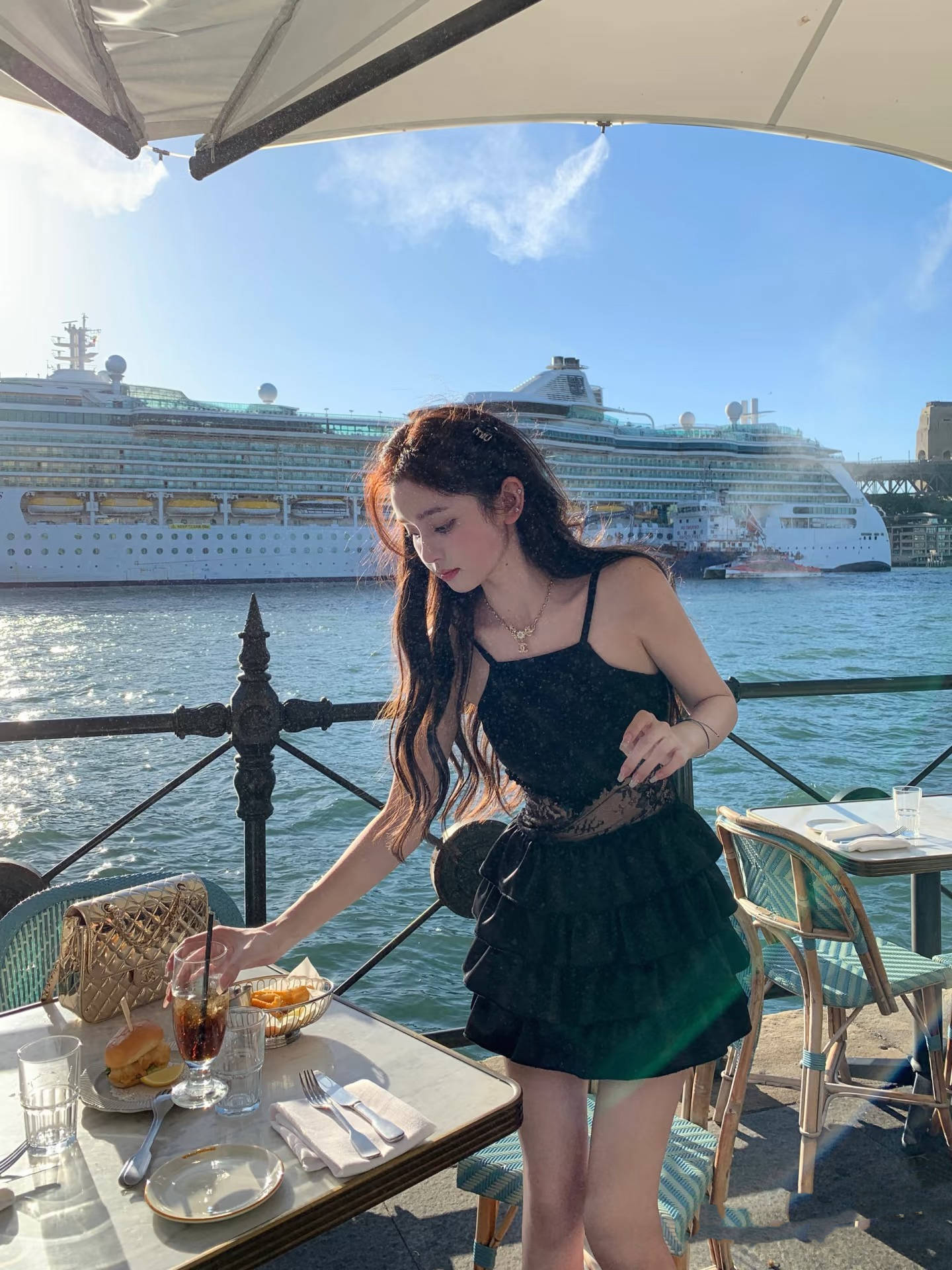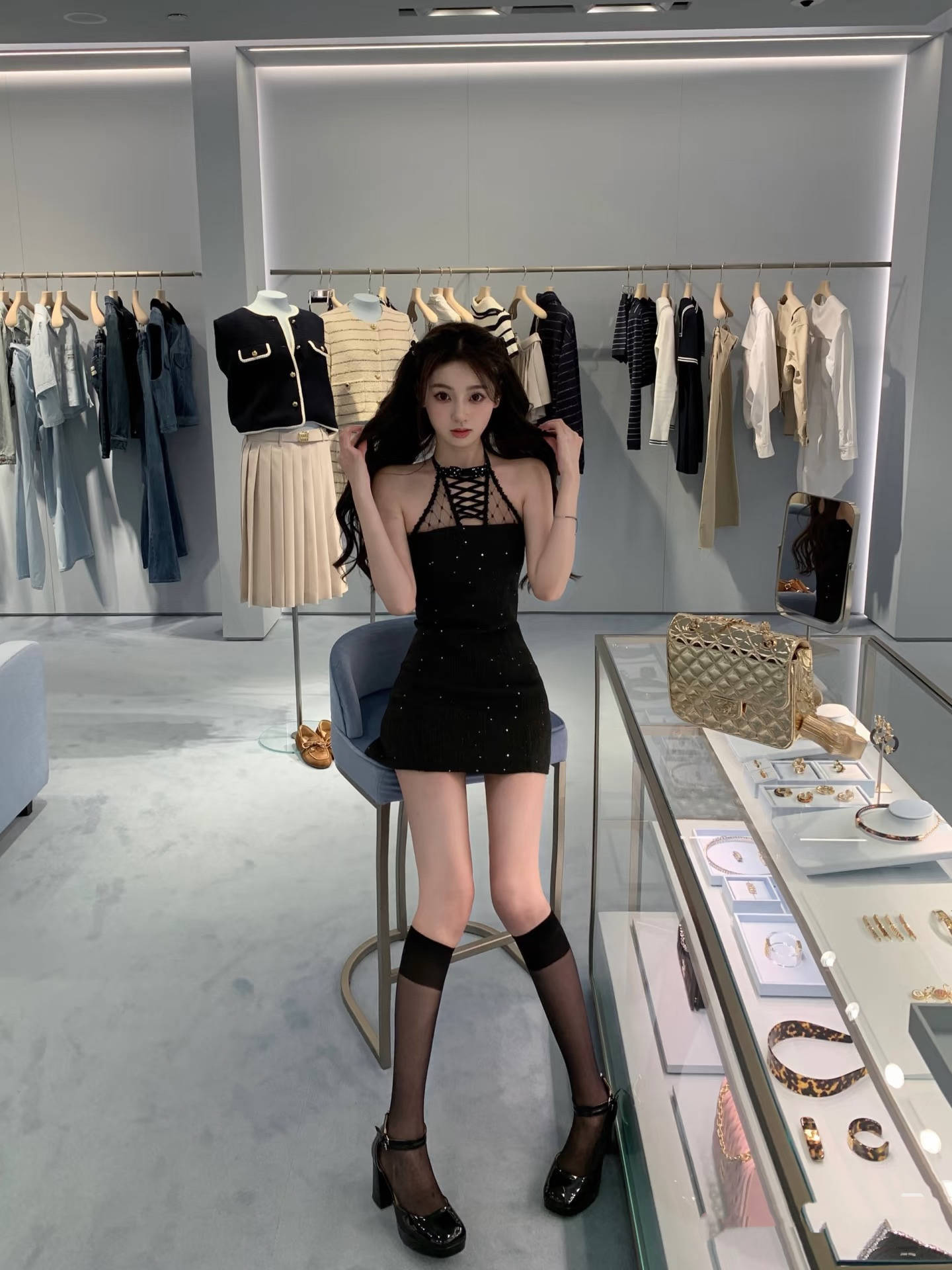 一身黑色穿搭,也会呈现出不一样的风格。挂脖裙、腰部薄纱设计,点缀蛋糕裙摆,性感中带一点可爱。